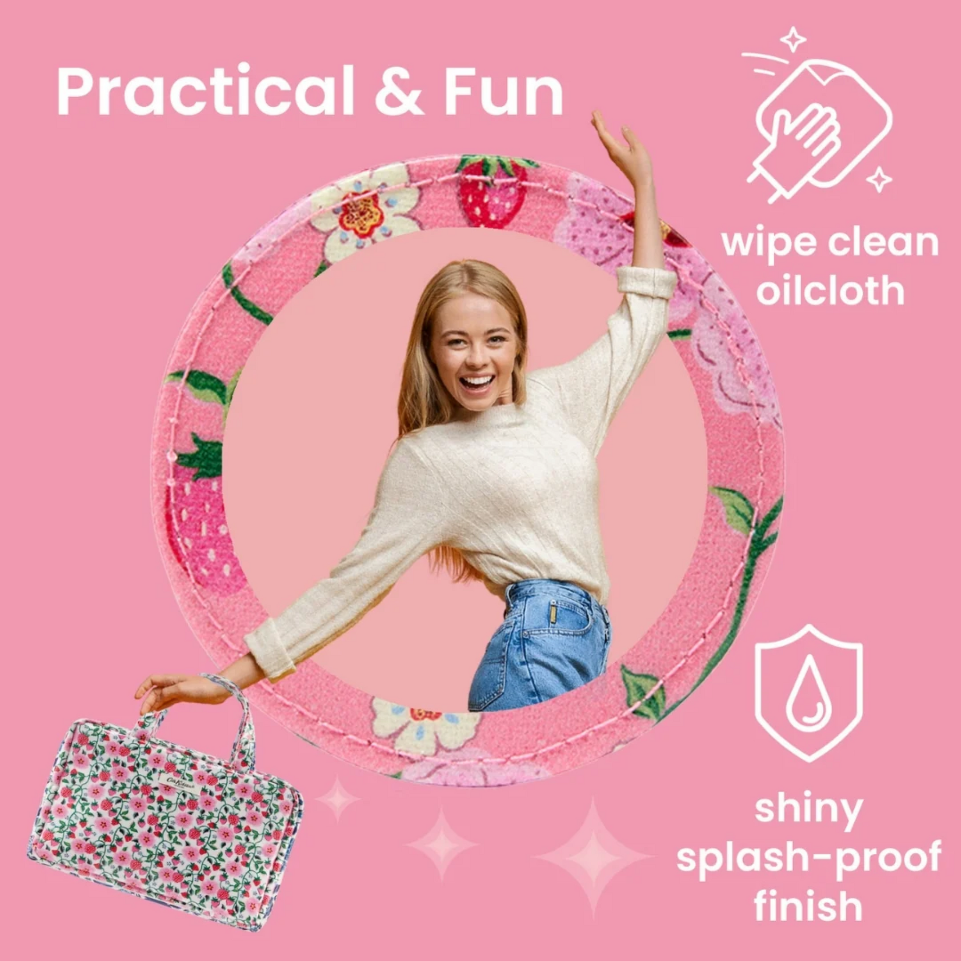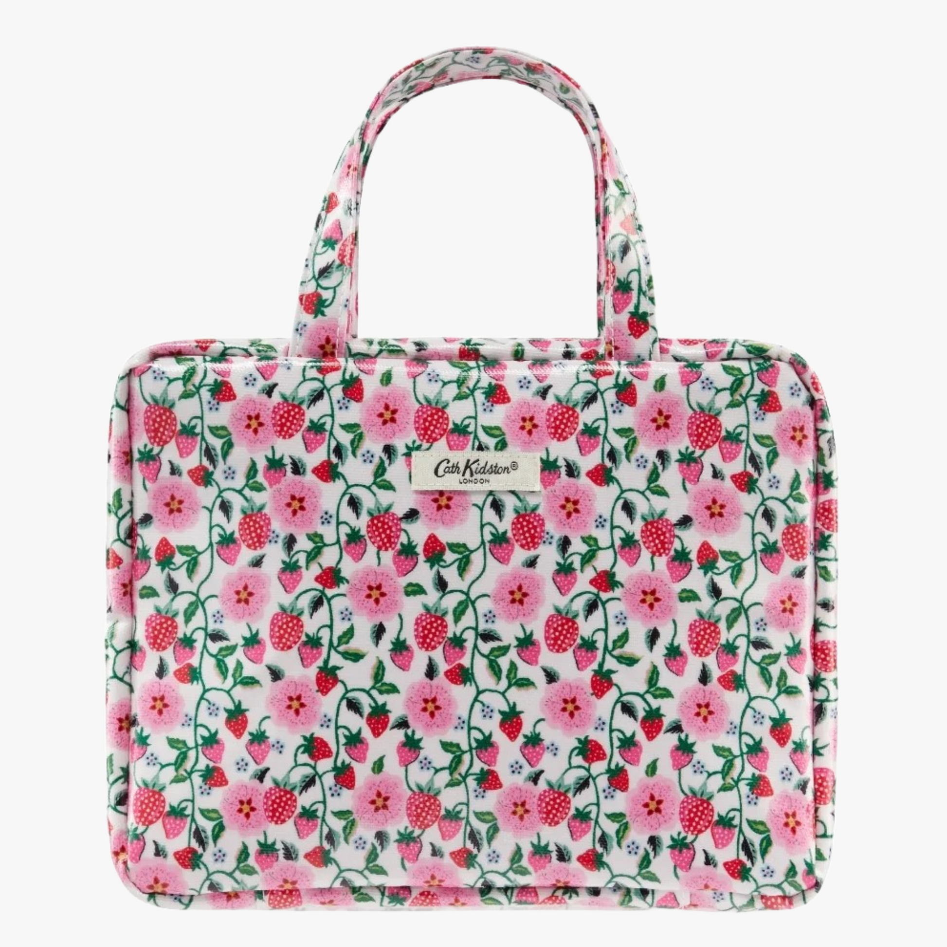 Your bathroom away from home. A spacious, two-part folding wash bag in the Strawberry print to hold all your beauty essentials, perfect whilst travelling or on holiday. Opens flat to reveal two waterproof, see-through compartments with zip closures.