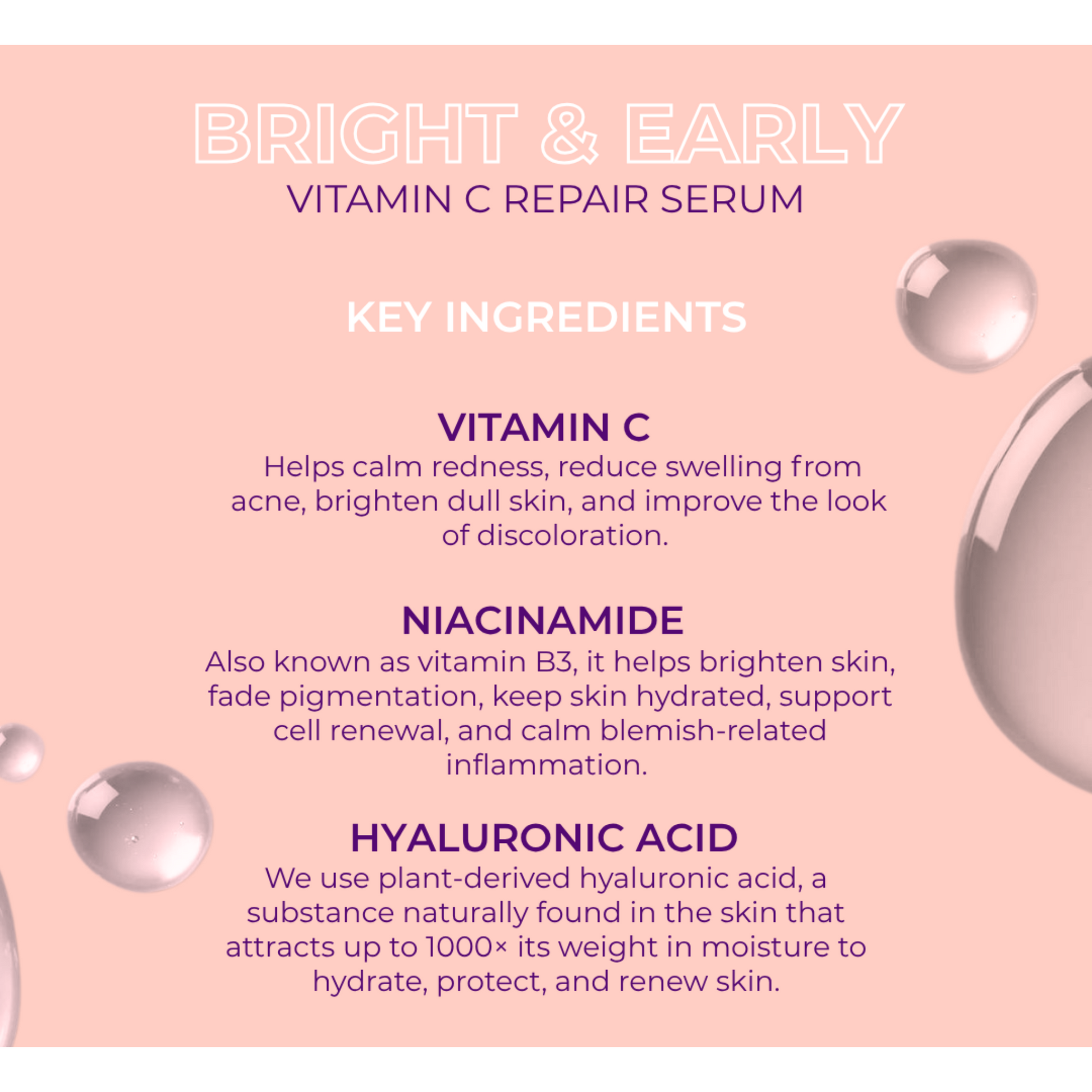 - Smooths and hydrates. Hyaluronic acid and niacinamide support a healthy skin barrier.