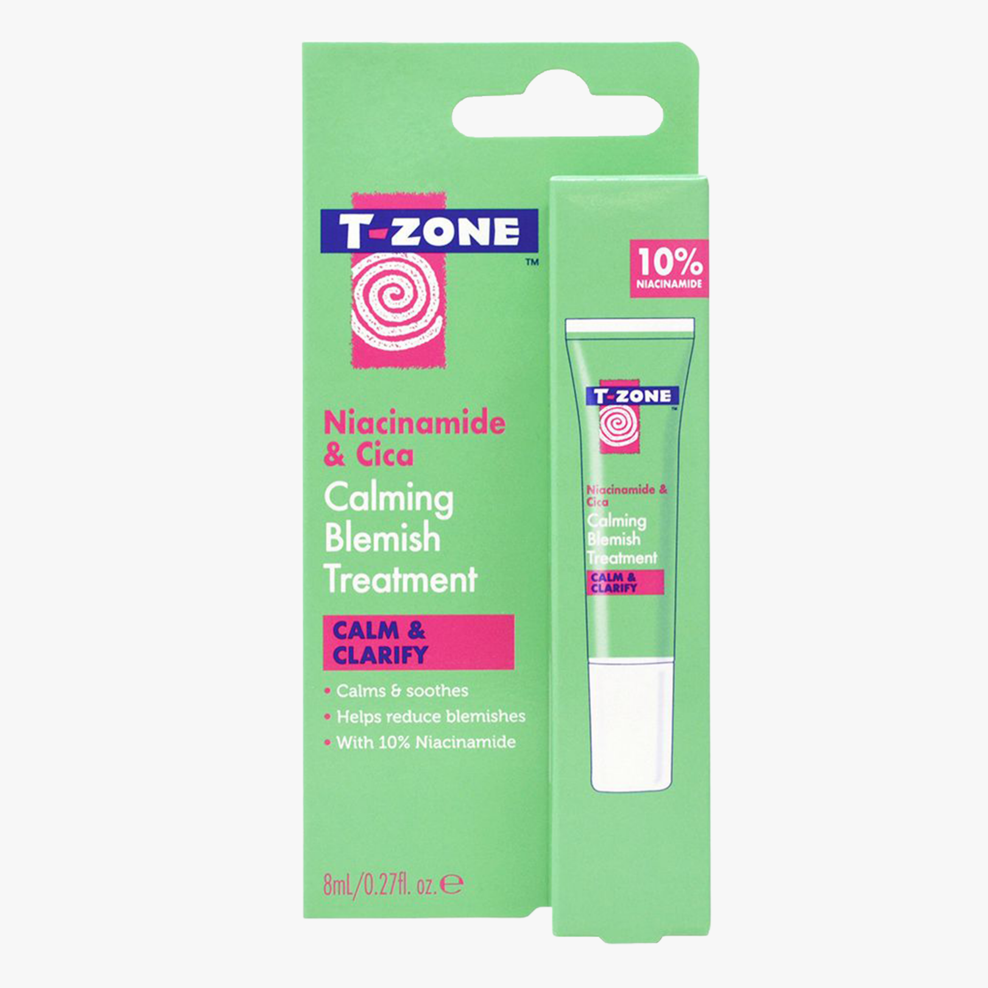 T-Zone Skincare Calming Blemish Treatment rapidly targets, prevents and calms spots and blemishes. This calming and clarifying treatment combines 10% Niacinamide & Cica to help promote great looking skin.